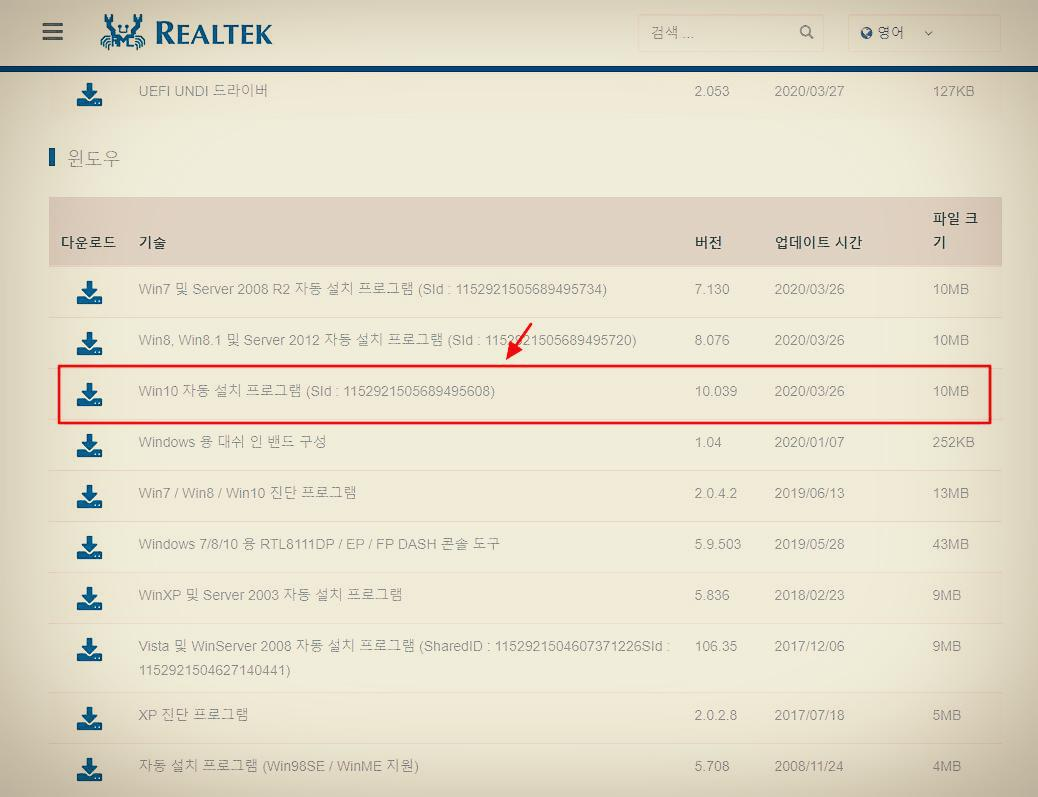 리얼텍(realtek) 랜카드를 사용하신다면 아래 사이트를 통하여 다운로드가 가능합니다.