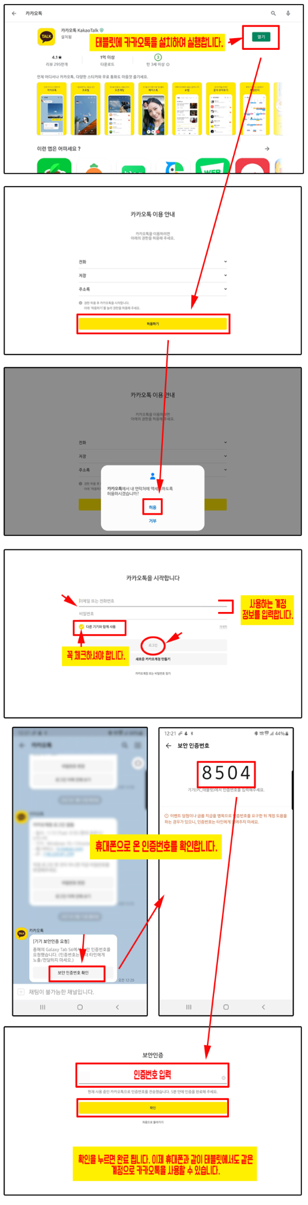 태블릿에 카카오톡을 설치하여 휴대폰에서 사용한 것과 같은 계정으로 동시에 사용하는 방법을 설명해 드리겠습니다.