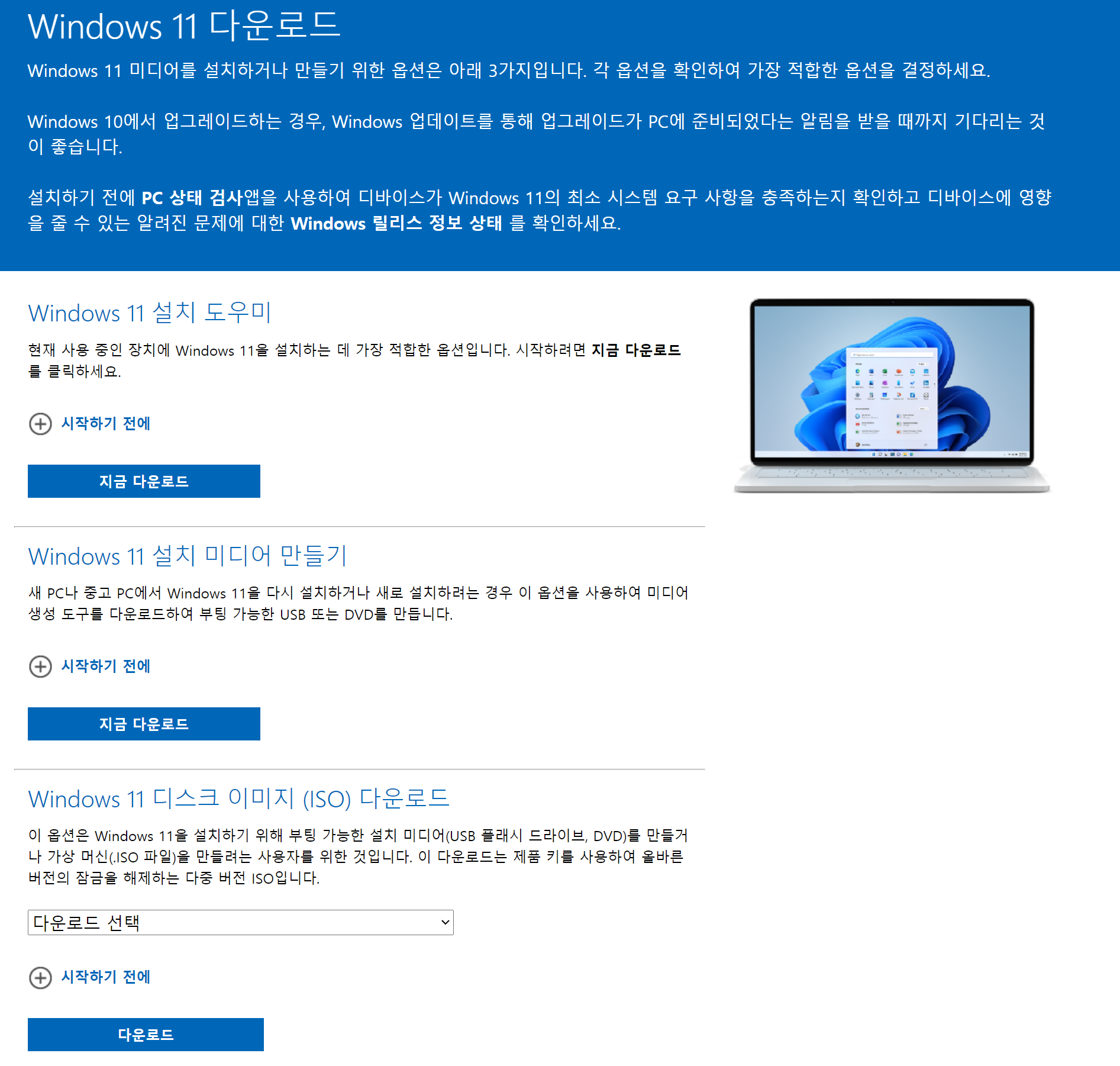 → 윈도우10 사용자는 해당 파일을 다운로드하여 실행하면 윈도 11로 업데이트됩니다. (하드웨어 지원 시 가능)