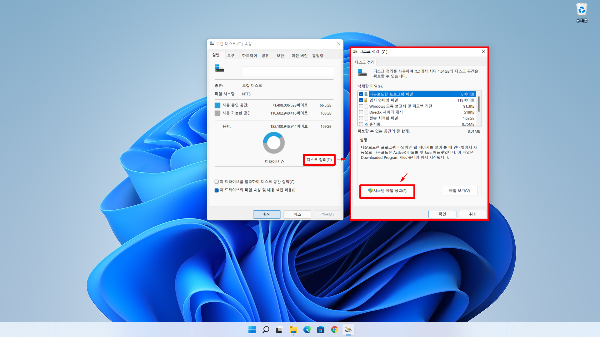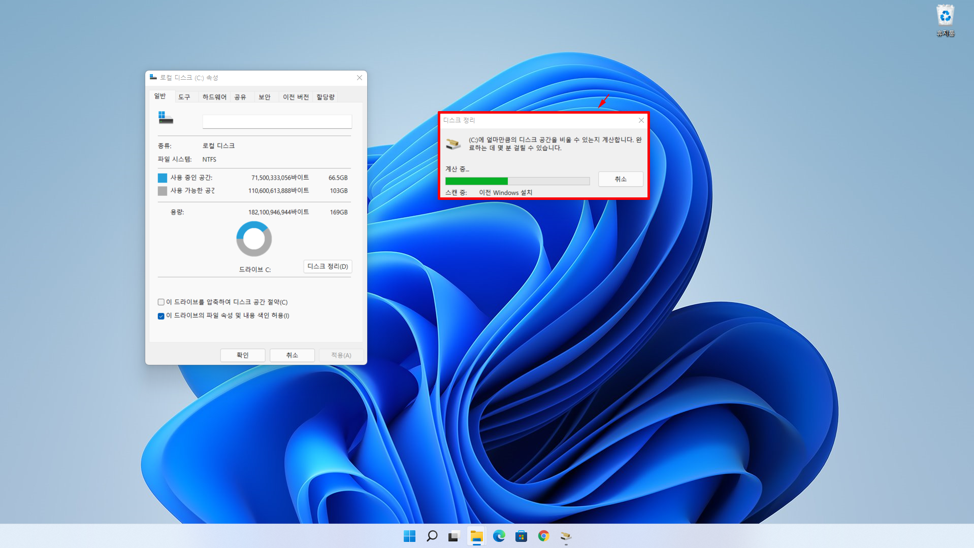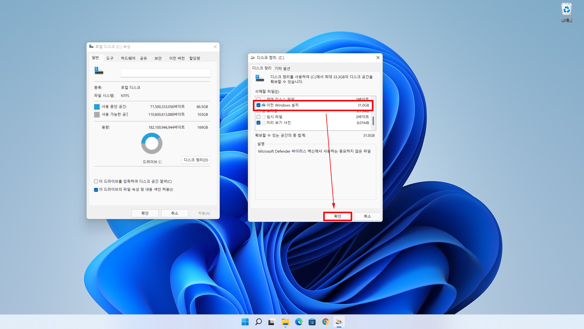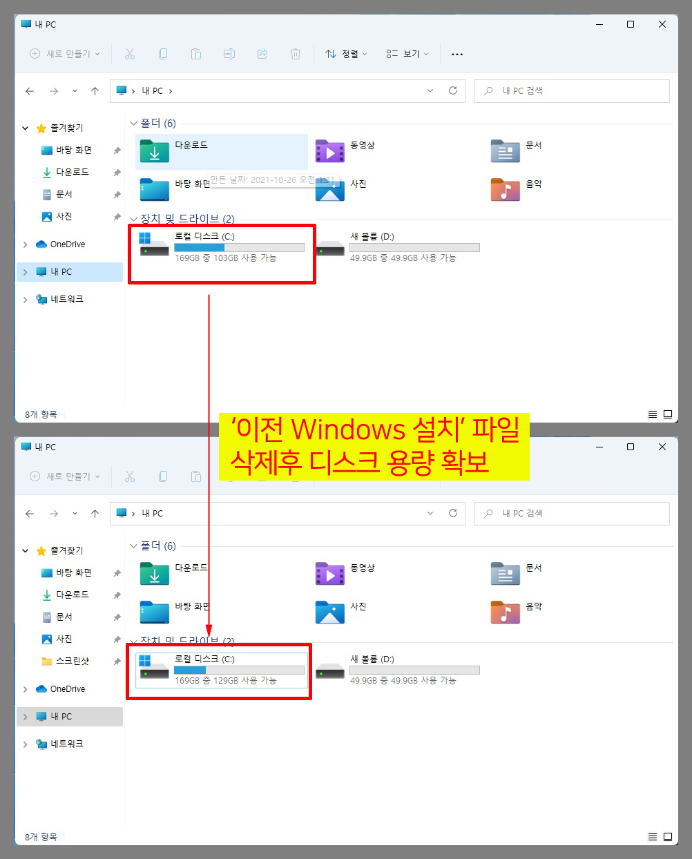 [Windows 11] 업데이트 후 용량이 부족해졌다면? 이전 윈도우 파일 삭제법 Blog J PC·Windows 문제 해결/Windows 11 설정 2021. 10. 27. Windows 10에서 업그레이드를 하고 나면 이전 Windows가 자동으로 저장됩니다. 아래와 같이 이전 Windows를 삭제하여 용량을 확보해 보세요. 아래와 같이 진행하면 됩니다. C드라이브를 마우스 우클릭하여 속성 → 디스크 속성창에서 '디스크 정리'를 선택합니다. '디스크 정리' 창에서 '시스템 파일 정리'를 선택합니다. 디스크 정리 화면이 나옵니다. 시간이 약간 소요될 수 있습니다. 해당 목록에서 '이전 Windows 설치' 항목을 선택 후 '확인'을 선택하면 해당 파일이 삭제되며 용량이 확보됩니다. 반응형 공유하기 게시글 관리 Blog J | 디지털·생활 문제 해결 정리 저작자표시 비영리 변경금지 (새창열림) 'PC·Windows 문제 해결/Windows 11 설정' 관련 글 더 보기 [Windows 11] 초기 설치 시 인터넷 연결 건너뛰고 '로컬 계정' 만드는 꿀팁 2021.10.30 더 읽기 [Windows 11] 가운데 정렬이 어색해? 작업표시줄 아이콘 왼쪽으로 옮기기 2021.10.29 더 읽기 [Windows 11] 자주 쓰는 프로그램 1초 실행! 작업표시줄 바로가기 아이콘 고정 2021.10.27 더 읽기 Windows 10 | 부팅 속도가 느릴 때 빠른 시작 기능 설정 방법 2021.06.21 더 읽기