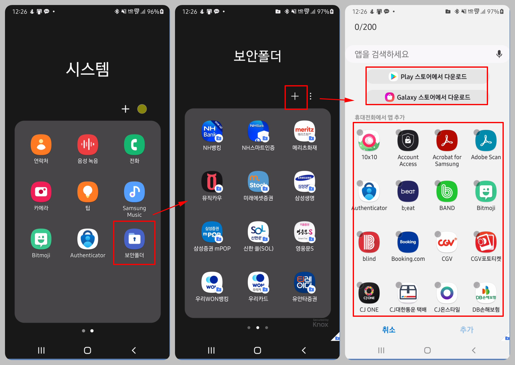 ▼ 보안폴더에 접속하여 사용할 어플 설치합니다. 스토어나 기존 설치된 어플에서 가져올 수 있습니다.