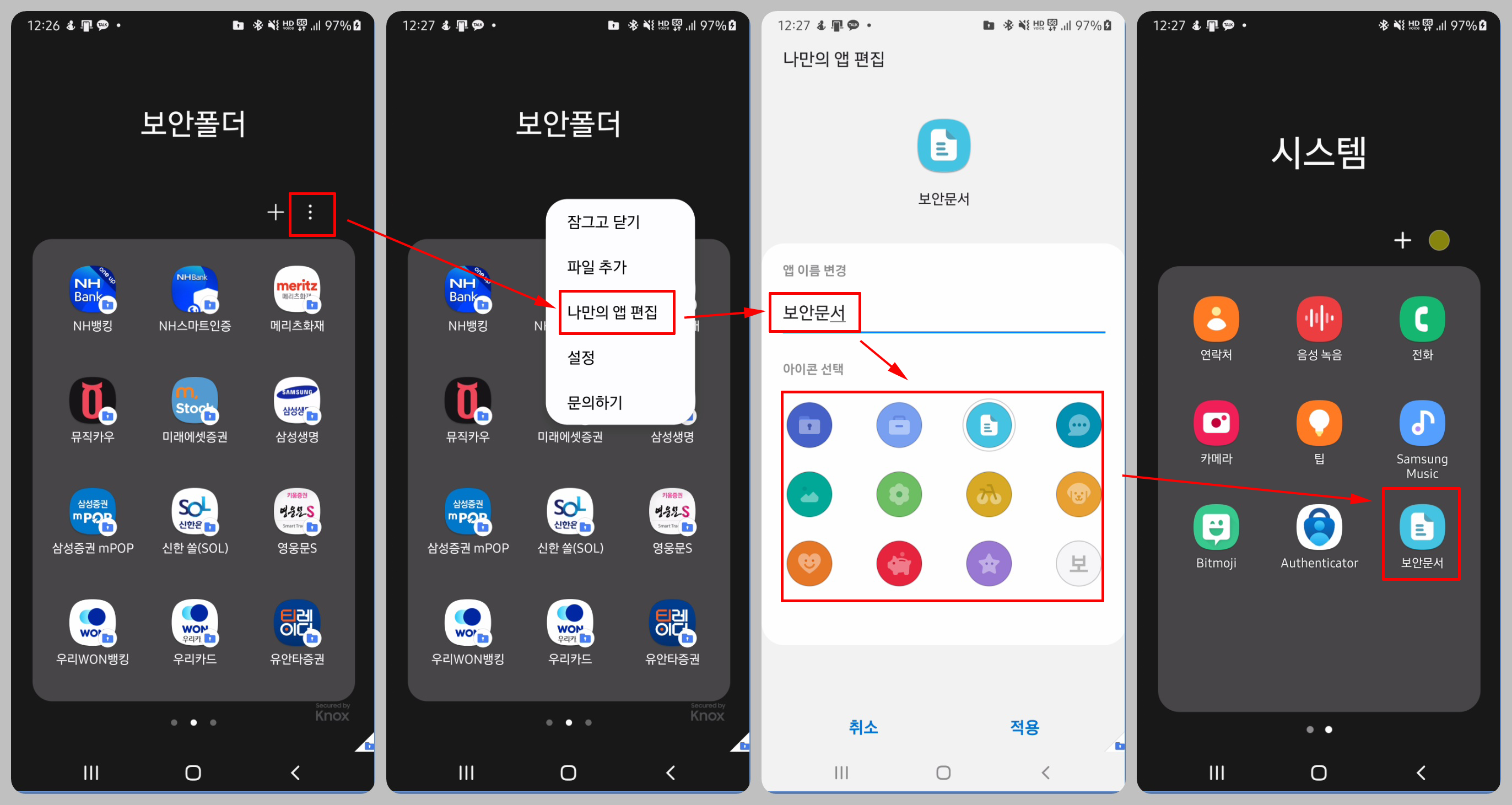 ▼ 보안 폴더 메뉴 중 나만의 앱 편집을 통하여 보안폴더의 아이콘과 이름을 자유롭게 변경할 수 있습니다.