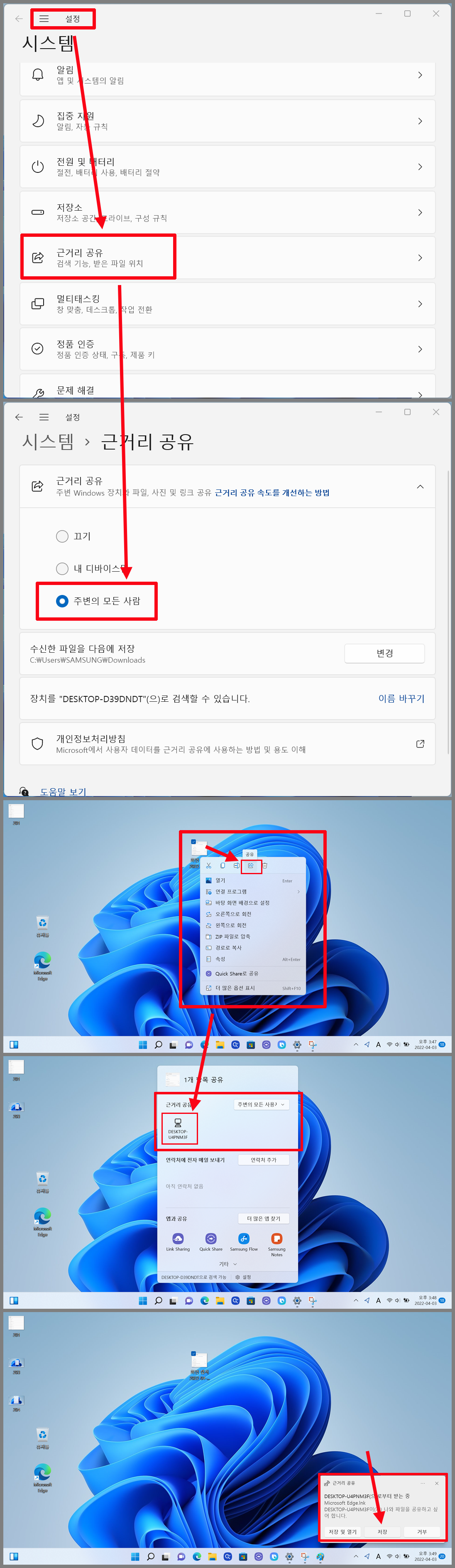 설정방법 : 설정 → 근거리 공유 → 근거리 공유 설정(주변의 모든 사람)파일 전송 : 해당 파일 우클릭 → 팝업 메뉴 → 공유 아이콘 → 근 거러 공유 항목에 해당 PC 선택 → 상대 PC에서 파일 수신 허용