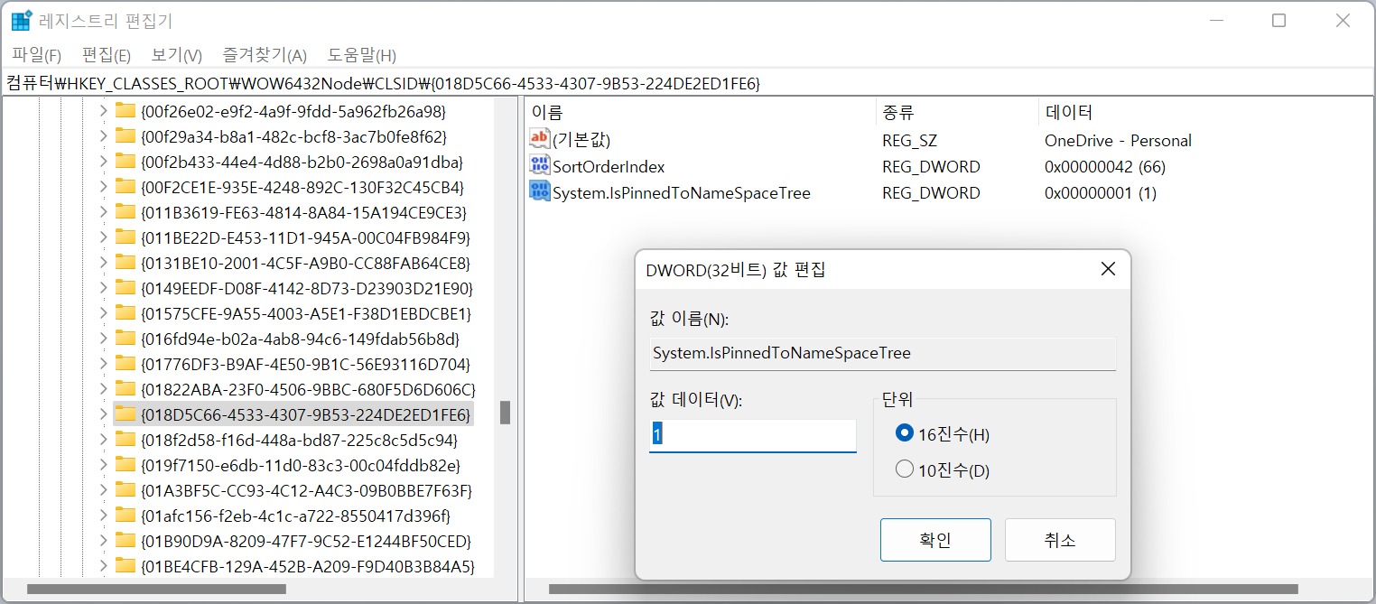 오른쪽 메뉴 중 System.IsPinnedToNameSpaceTree 값을 두 번 클릭하여 0을 1로 변경합니다.