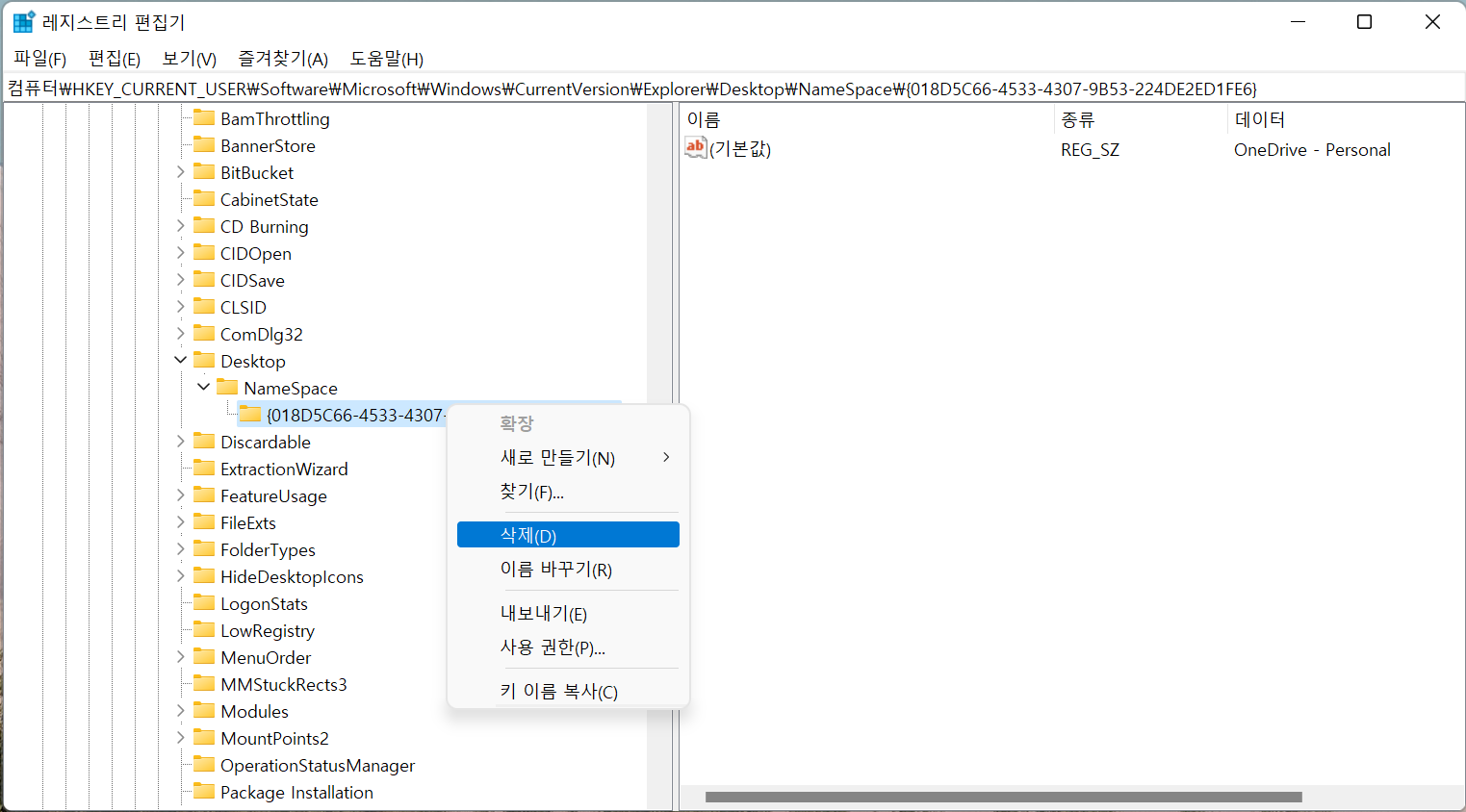 위 폴더 하위의 {018D5C66-4533-4307-9B53-224DE2ED1FE6} 항목을 삭제합니다.