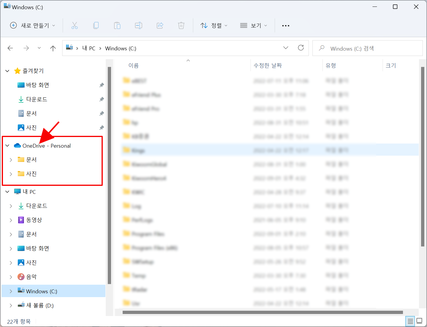 Windows 11에서 OneDrive를 사용하지 않고 걸리적거릴 경우 해당 드라이브를 보이지 않게 하는 방법입니다.