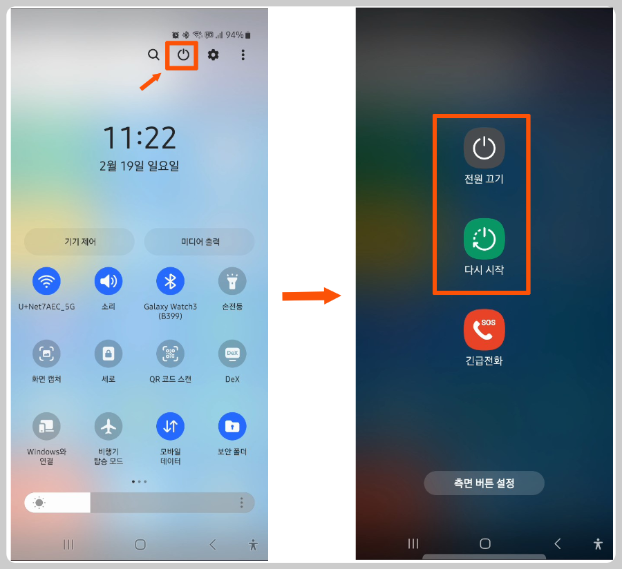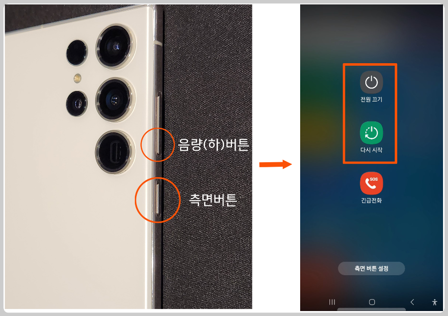 갤럭시 S23 전원 끄거나 재시작하는 방법과 먹통일 때 강제로 끄는 방법입니다.