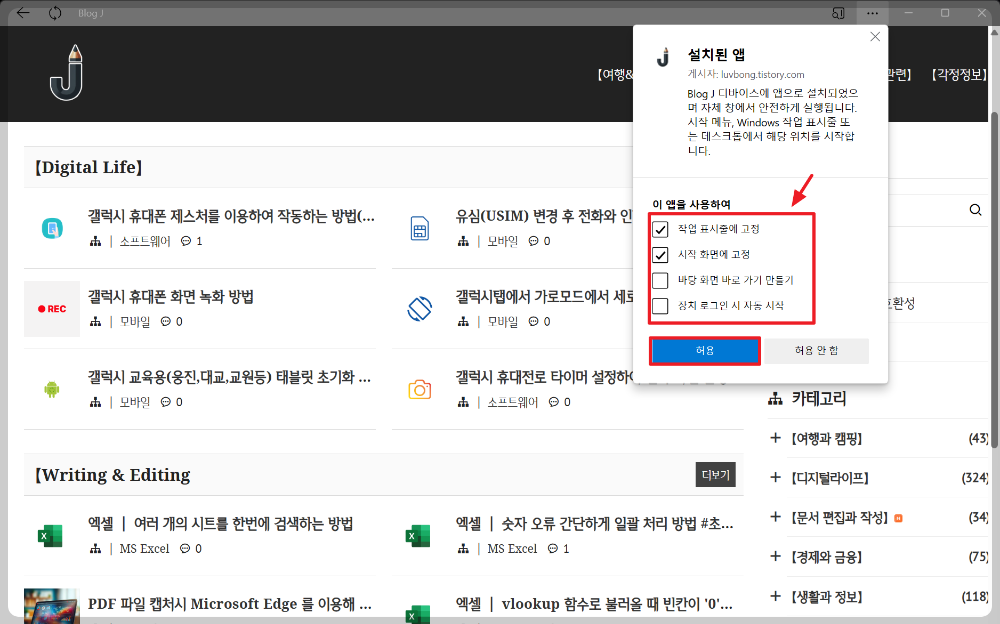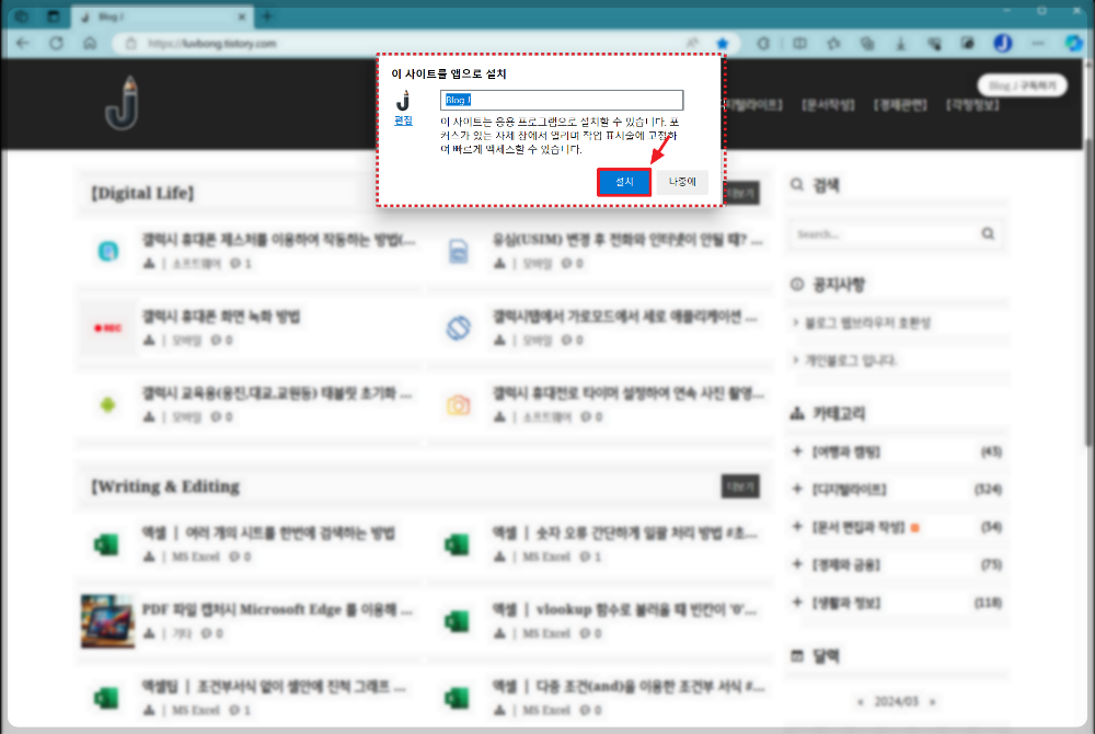마이크로소프트 엣지(Microsoft Edge)를 이용하면 자주 가는 사이트를 앱으로 설치할 수 있습니다.