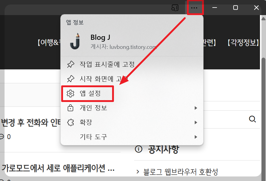 ▼ 아래와 같이 엣지를 실행한 상태에서 메뉴 → 앱 → '이 사이트를 앱으로 설치'를 선택합니다.