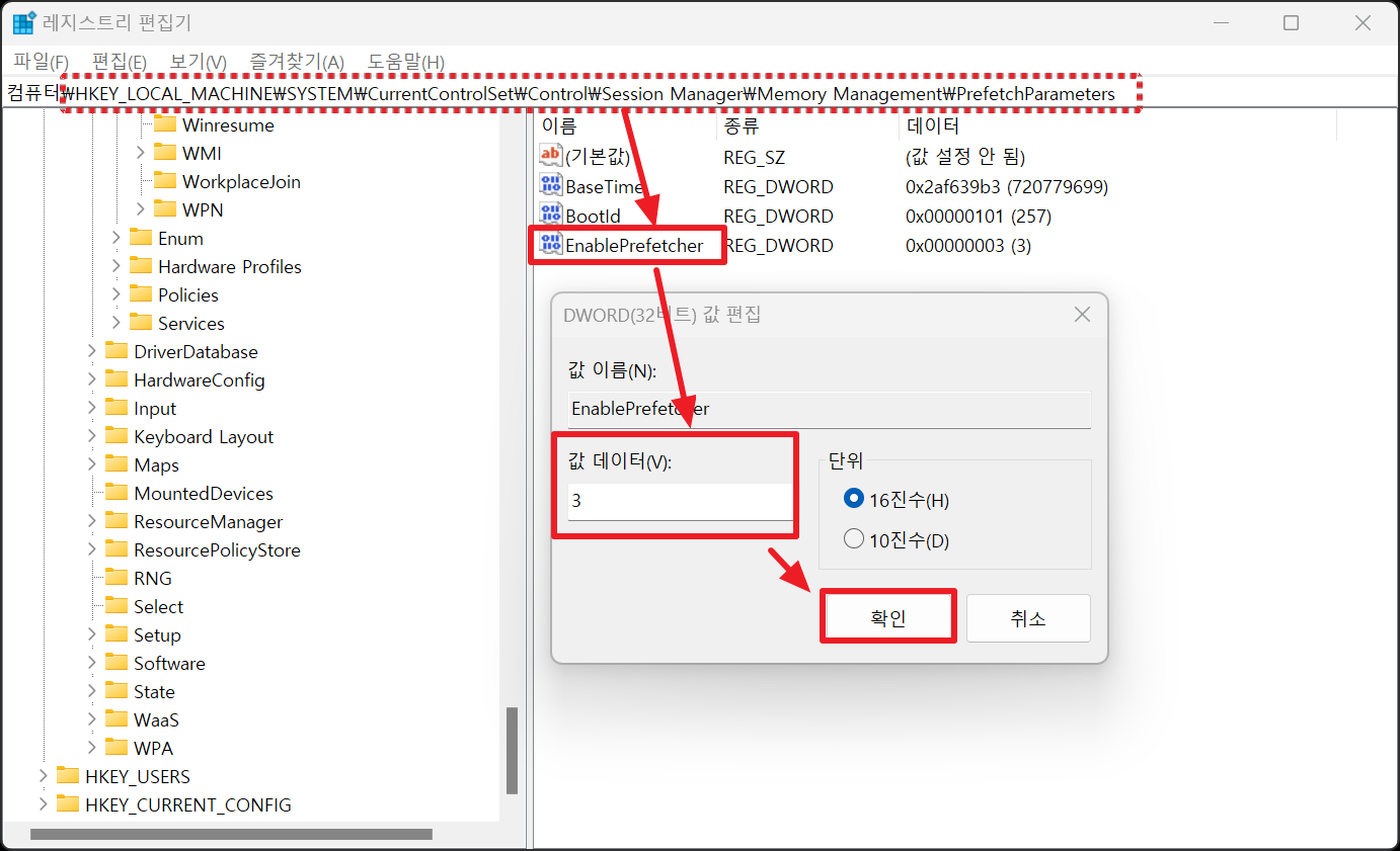 해당 폴더 안에 'EnablePrefetcher' 설정을 실행하여 값데이터를 변경해 줍니다.