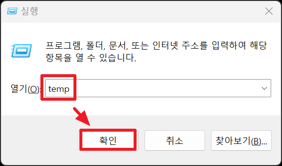 1. 윈도우 키(🪟)+R을 눌러 '실행' 창을 실행 후 ' temp' 와 '%temp%'적고 '확인(또는 엔터)'를 실행합니다.