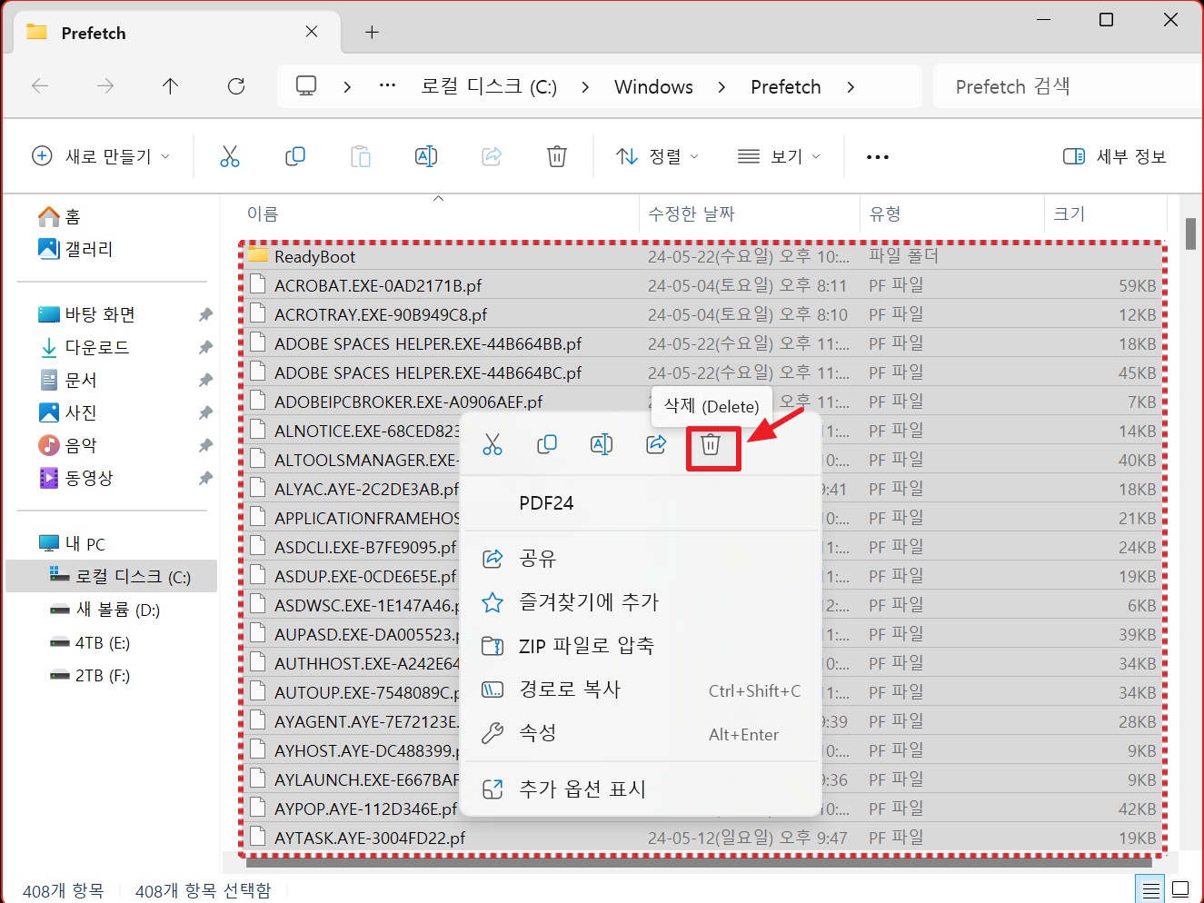 3. prefetch 폴더가 열리면 폴더 안에 있는 모든 파일(ctrl+A)을 삭제합니다.