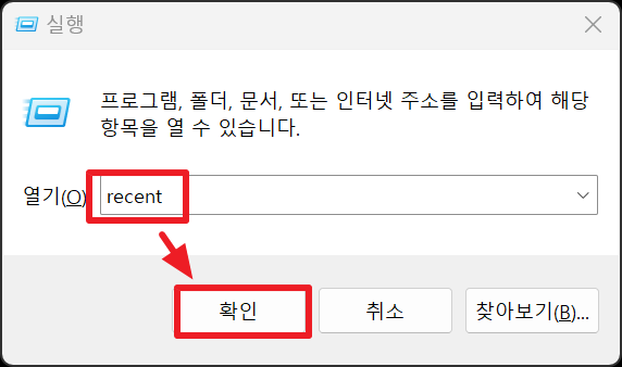 1. 윈도우 키(🪟)+R을 눌러 '실행' 창을 실행 후 ' recent' 적고 '확인(또는 엔터)'를 실행합니다.