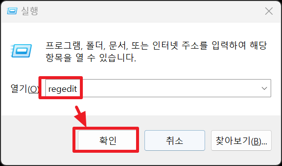 1. 윈도우 키(🪟)+R을 눌러 '실행' 창을 실행 후 ' regedit' 적고 '확인(또는 엔터)'를 실행합니다.