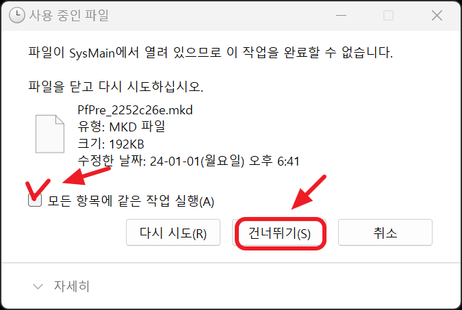 4. 아래와 같은 경고창이 뜨면 해당 파일은 현재 실행 중인 파일이므로 '건너뛰기'로 넘어갑니다.