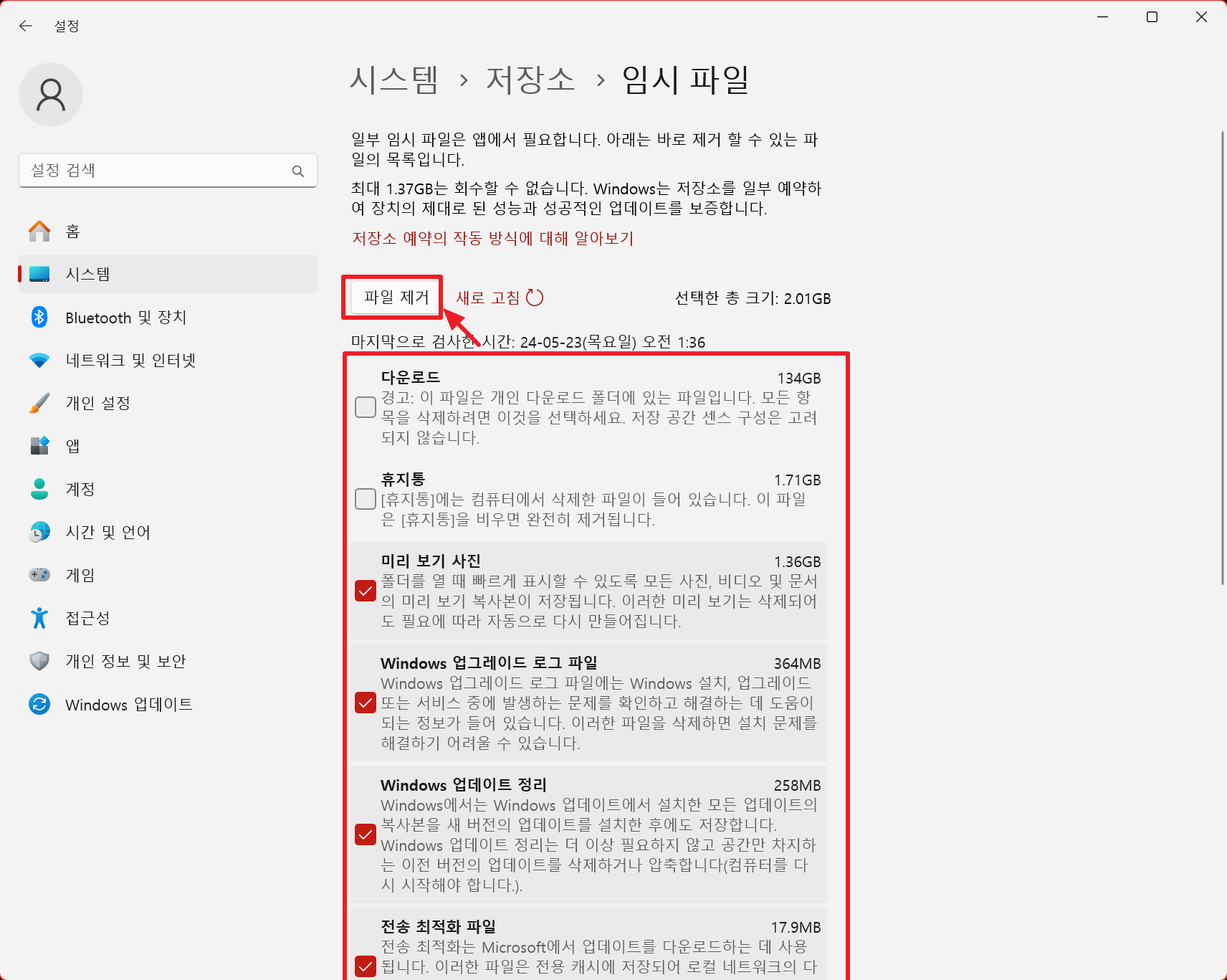 2. 위와 같이 저장소에서 임시파일을 선택하면 아래와 같이 제거하려는 항목을 선택 후 '파일 제거'를 실행합니다.