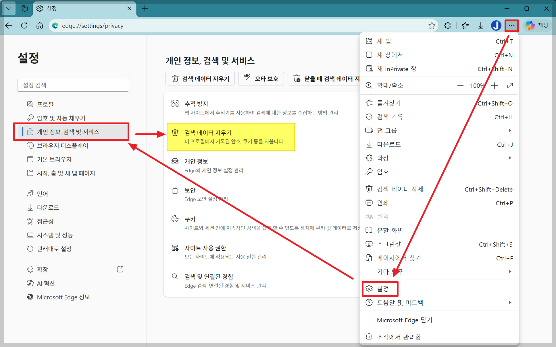 Microsoft Edge → 설정 → 개인정보, 검색 및 서비스