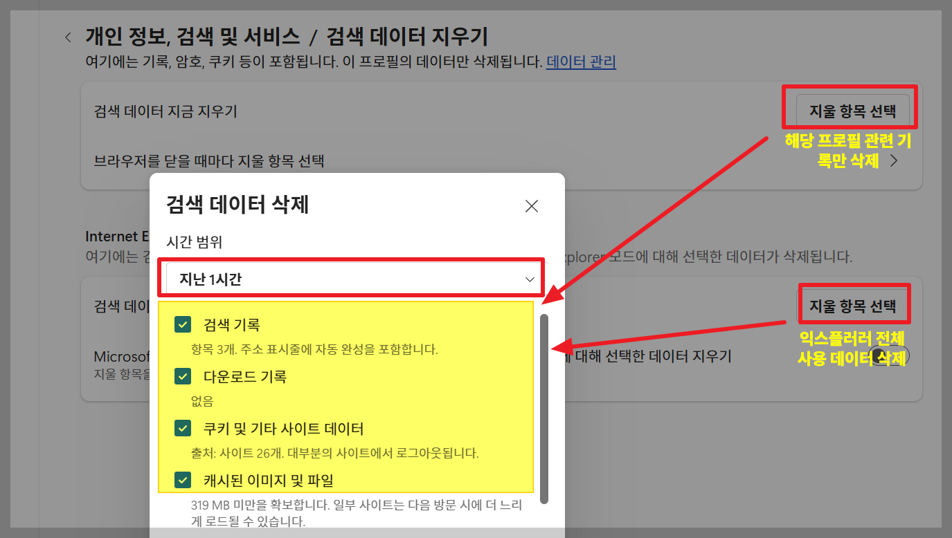 검색 데이터 지우기 → 지울 항목 선택