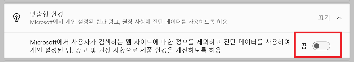 사용자 경험 개선용 데이터로 나뉩니다.선택적 진단 데이터와 맞춤형 환경만 꺼도