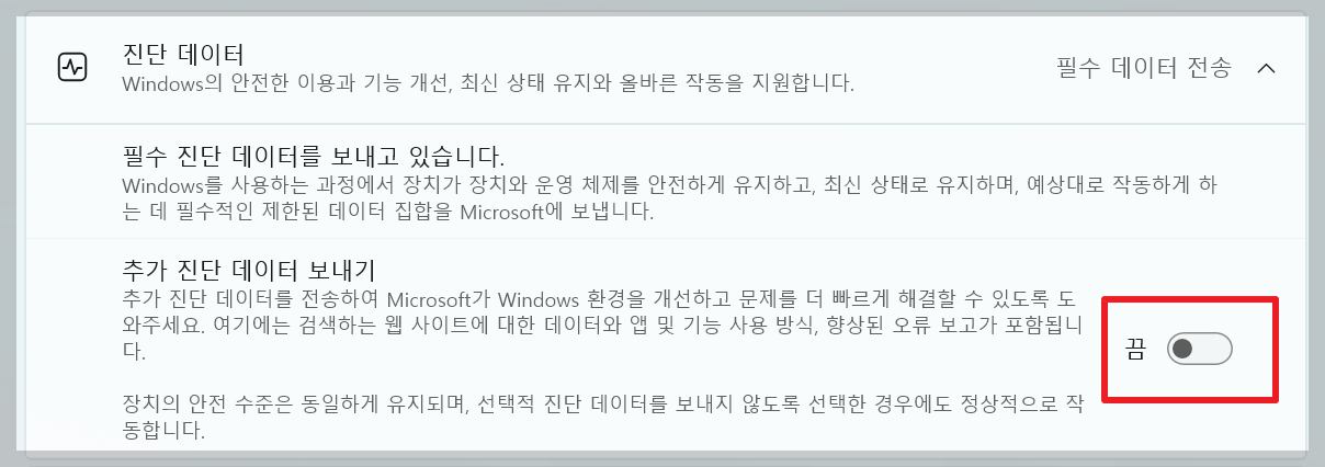 - 선택적 진단 데이터 보내기 → ❌ 끔