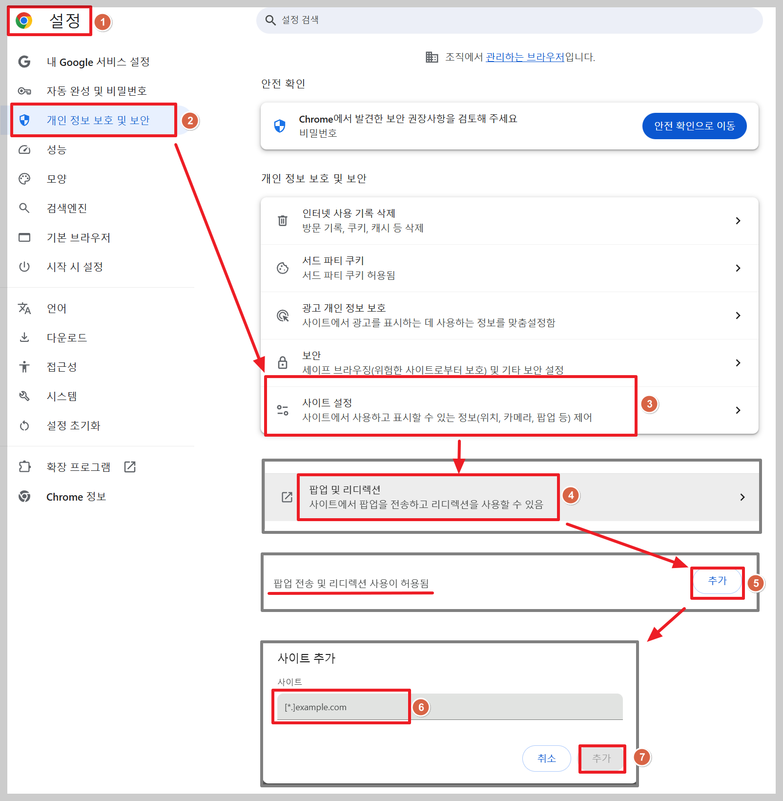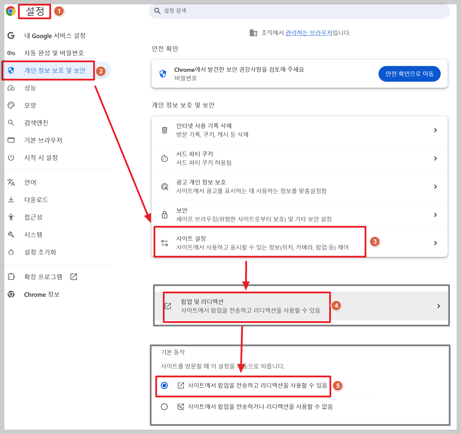 Chrome 설정 → 개인정보 및 보안 → 사이트 설정 → 팝업 및 리디렉션