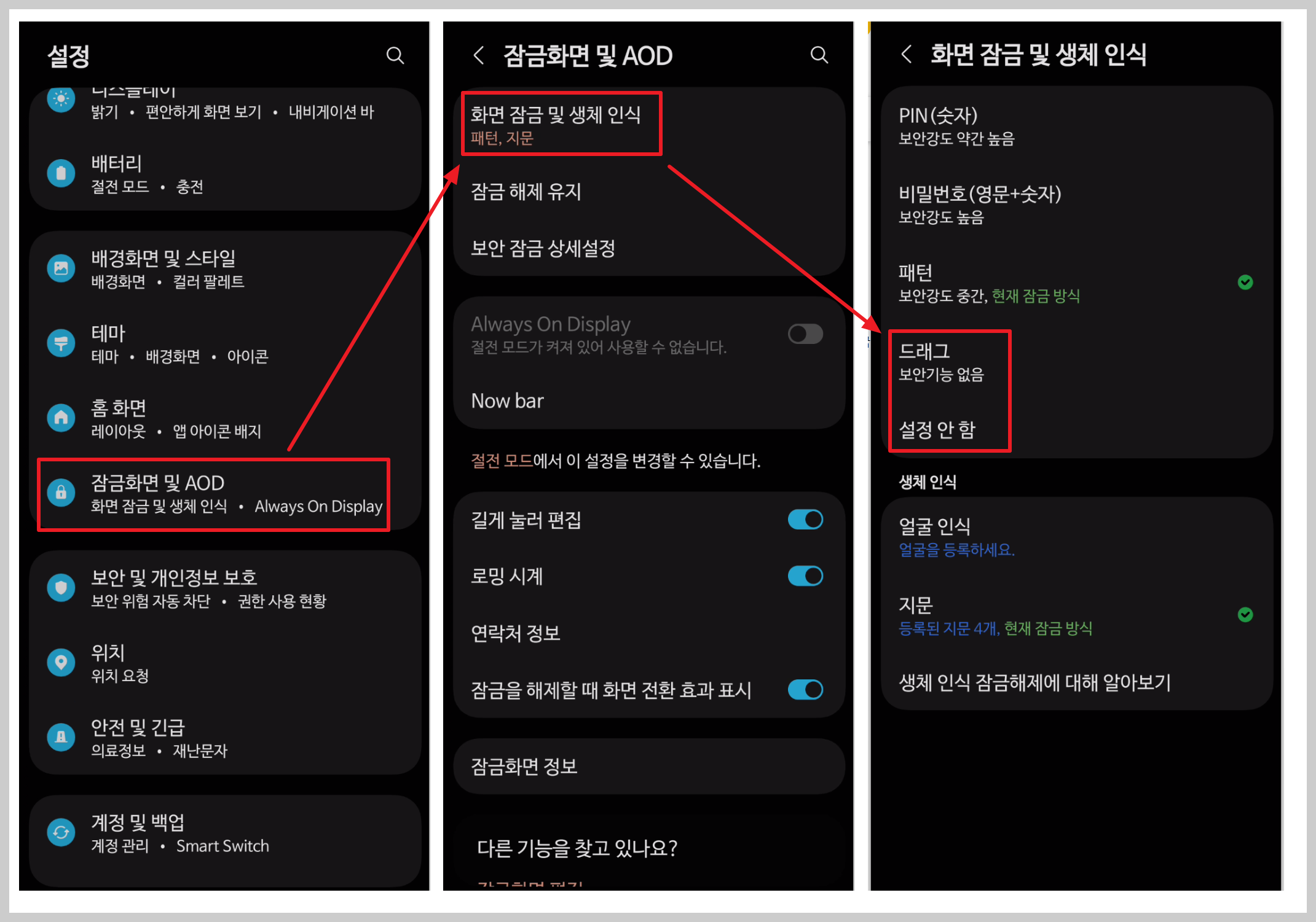 - 설정 → 잠금화면 및 AOD → 화면 잠금 및 생체인식 → 모든 잠금 방식 해제 후 "드래그" 또는 "설정 안함" 선택