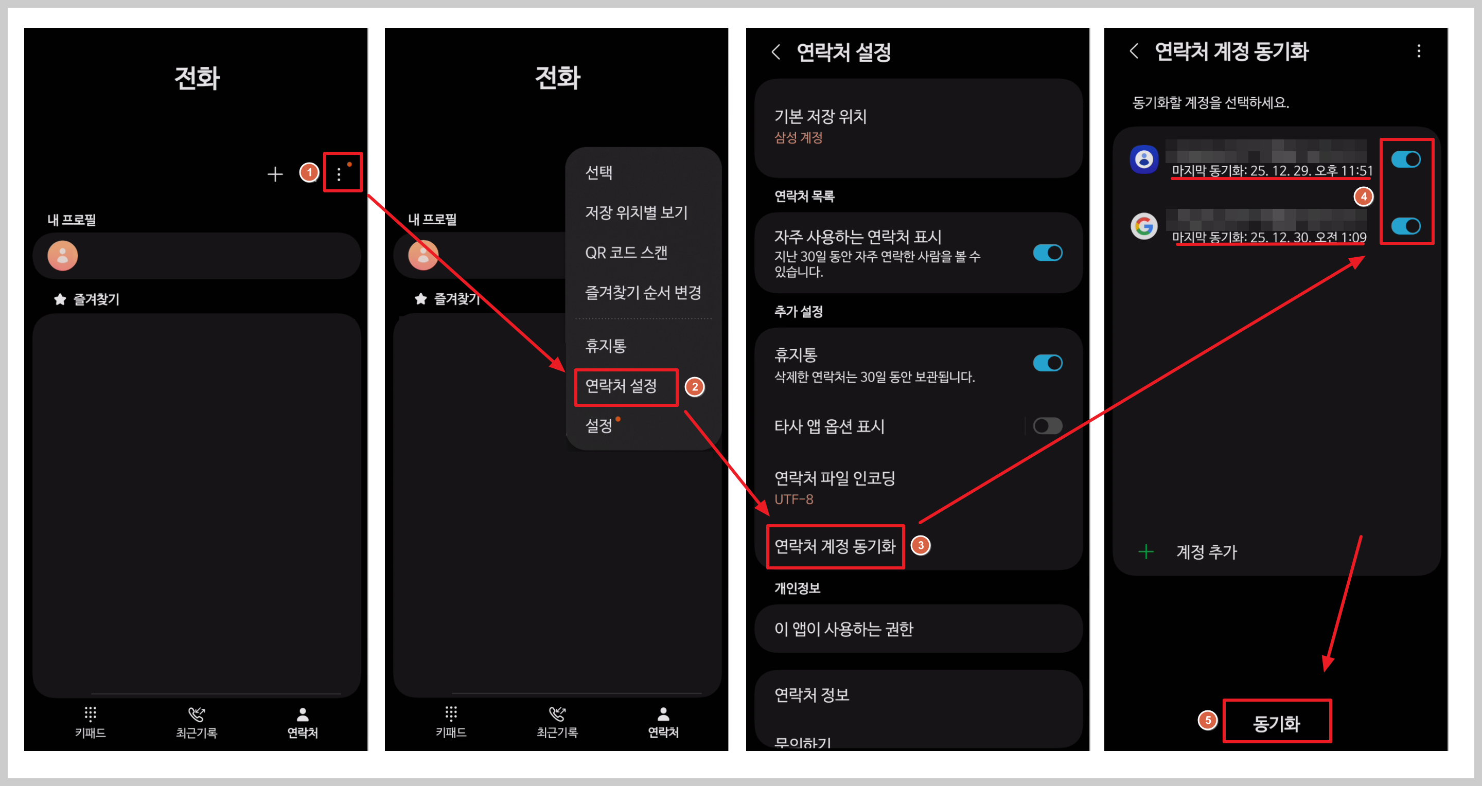 - 연락처 앱 → 연락처 설정 → 연락처 계정 동기화 → 계정 선택 → 동기화 (완료후 동기화 날짜 및 시간 확인)