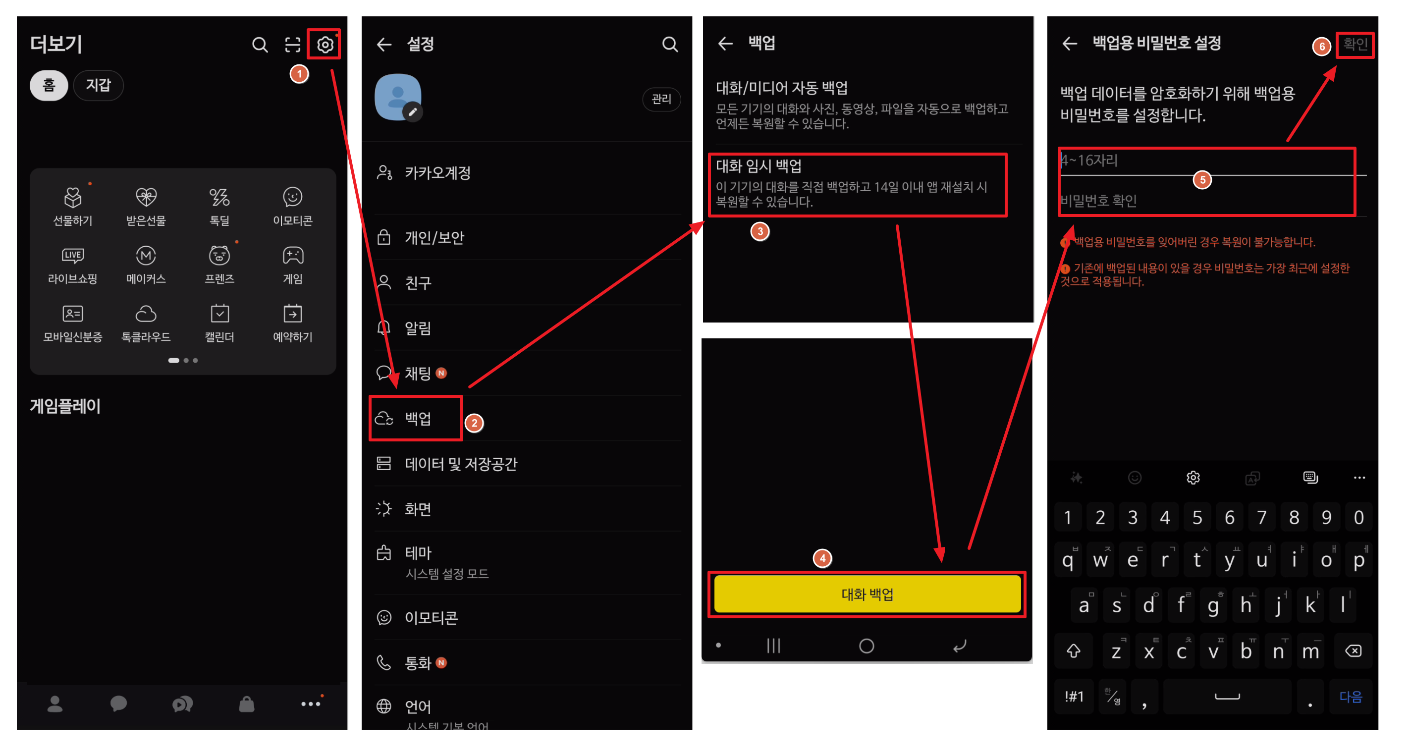 - 카카오톡 → 설정 → 백업 → 대화 임시 백업 → 대화 백업 → 비밀번호 4자리 이상 설정 (복원시 필요)