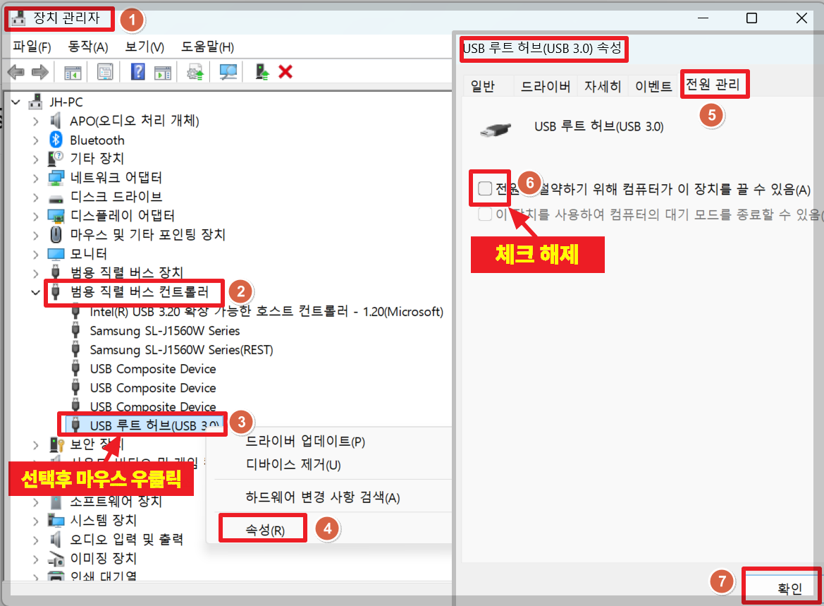 장치 관리자 → 범용 직렬 버스 컨트롤러 → USB 루트 허브 → 속성 → 전원 관리