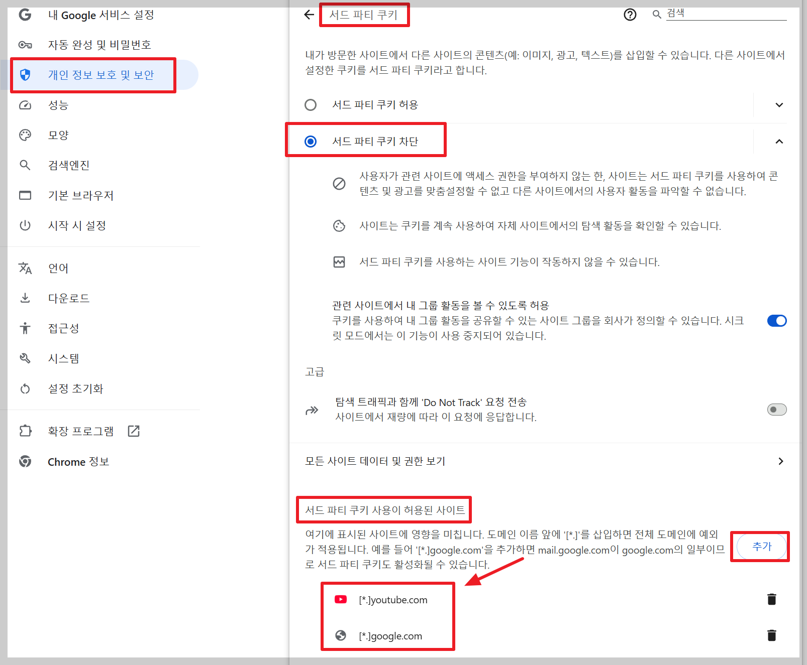 - '서드 파티 쿠키 사용이 허용된 사이트' 항목 옆의 [추가] 버튼을 누릅니다.