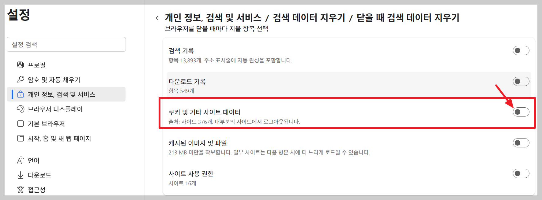 - 목록 중 [쿠키 및 기타 사이트 데이터] 스위치가 [꺼짐] 상태여야 합니다. (이게 켜져 있으면 브라우저 종료 시 로그아웃됩니다.)