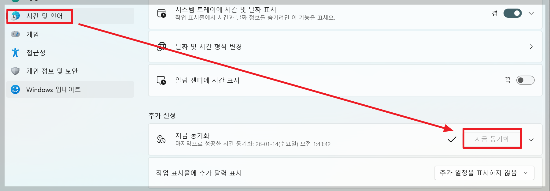 - [윈도우 키 + I] (설정) → [시간 및 언어] → [날짜 및 시간]