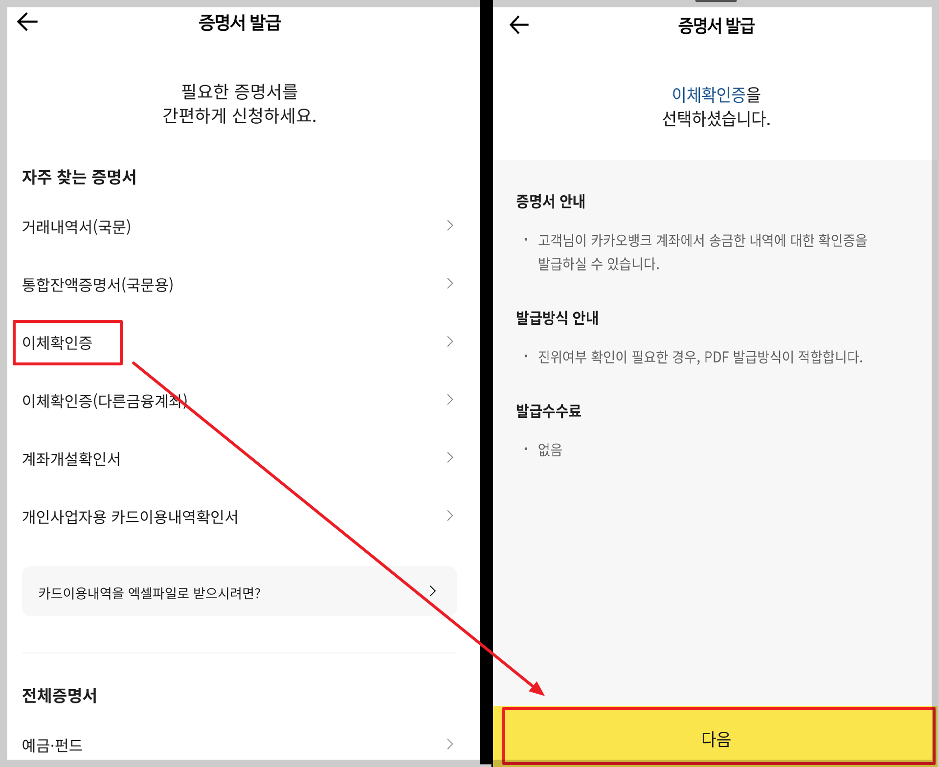 - [이체확인증] > [다음]을 선택합니다.