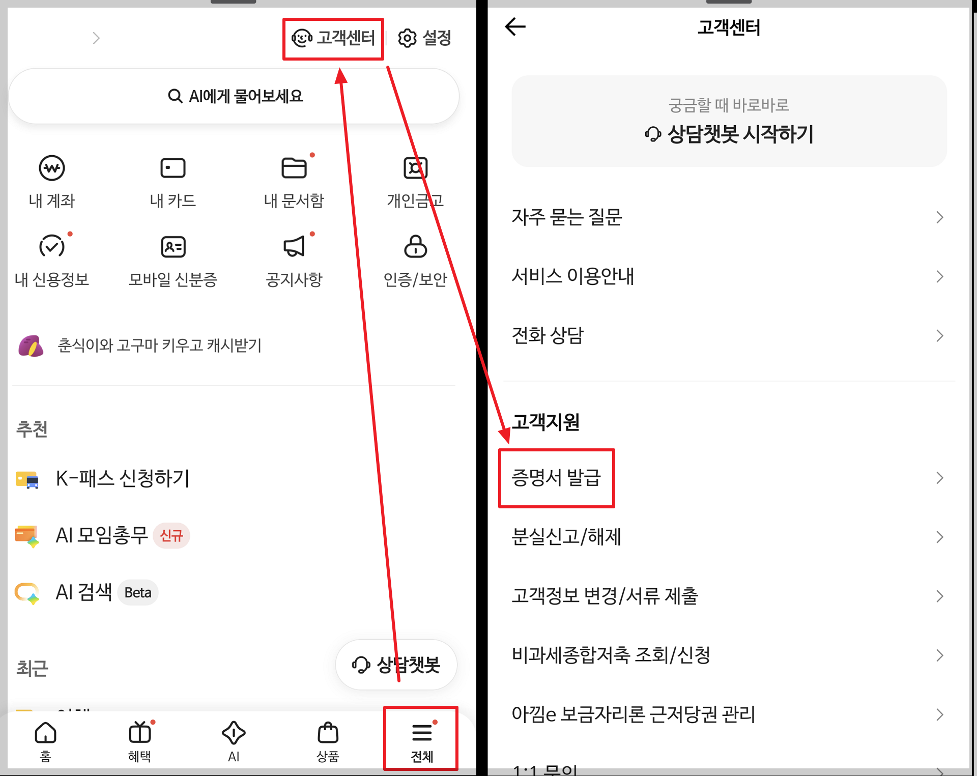 - 전체메뉴 [바 3개] → 상단의 [고객센터]를 클릭합니다.